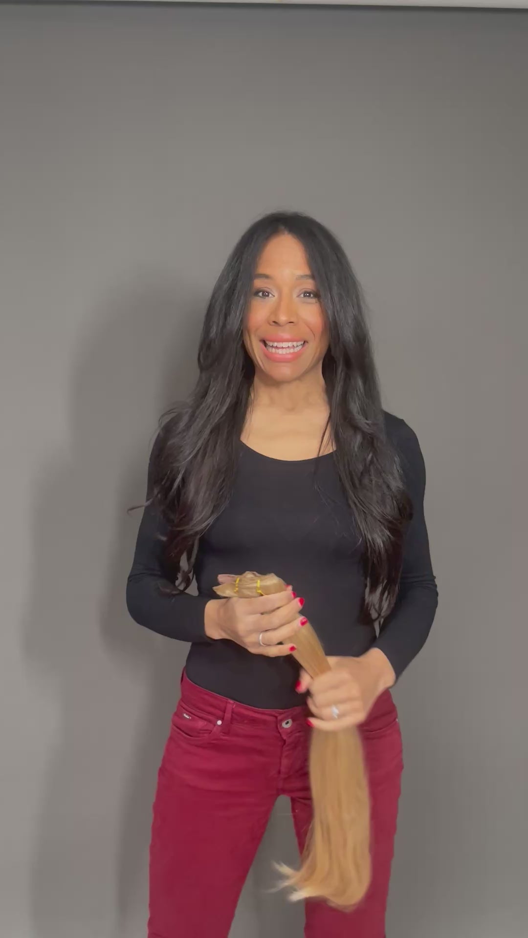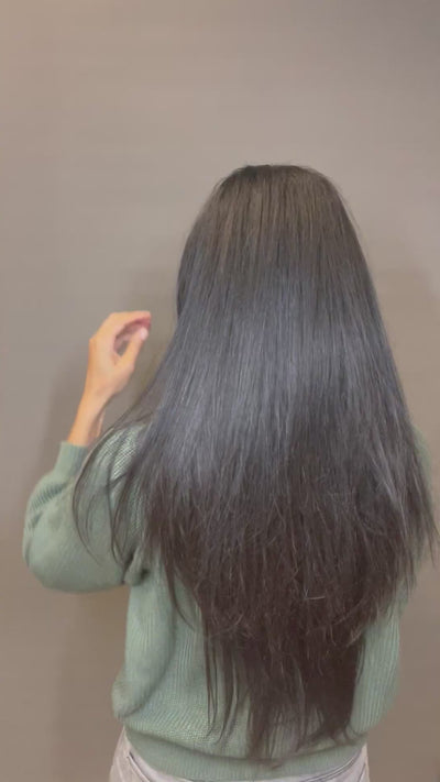 In den Videos trage ich selbst das 55cm One Piece in der FArbe 1B, bei einer eigenen Haarlänge von 45cm und einer Körpergrösse von 1.72. Ich mag die Abstufung besonders, gerade auch wenn die Haare gestylt mit einer leichten Welle sind. Sie verleiht eine Leichtigkeit mit fashion Effekt.